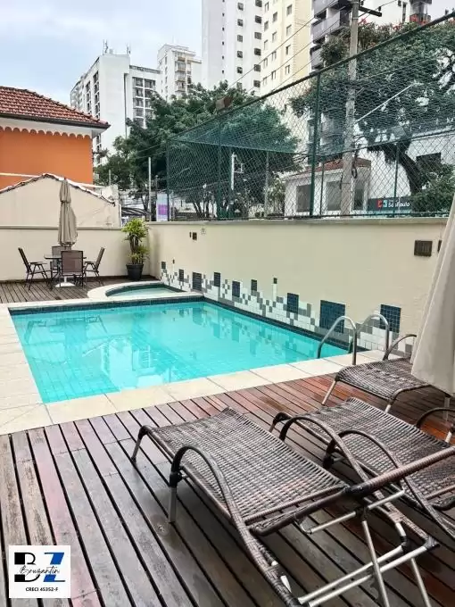 Prédio com salão de festas, piscina e churrasqueira.