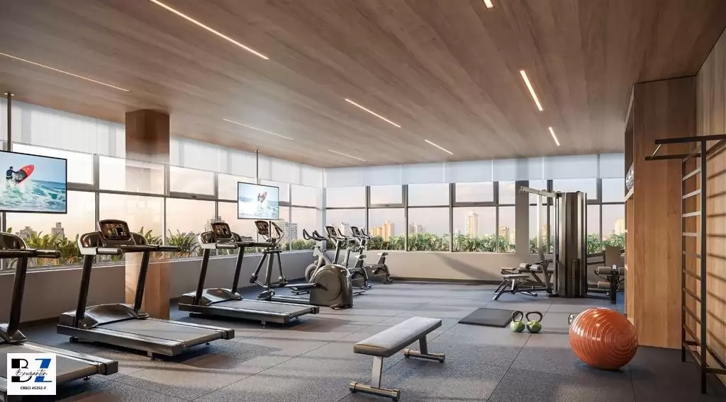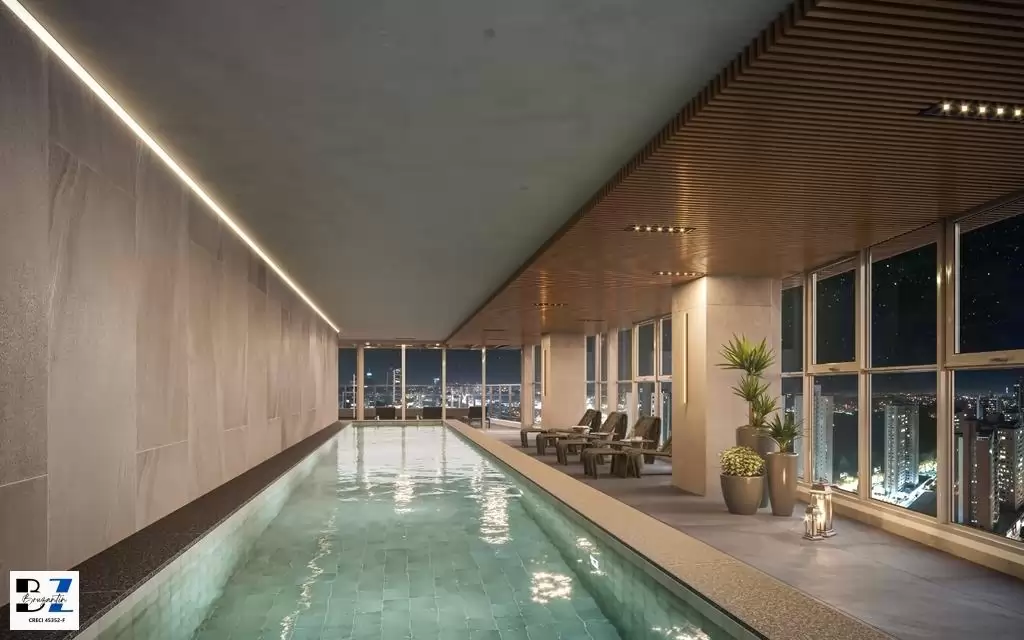 Prédio com salão de festas, academia, piscina coberta aquecida, piscina externa.